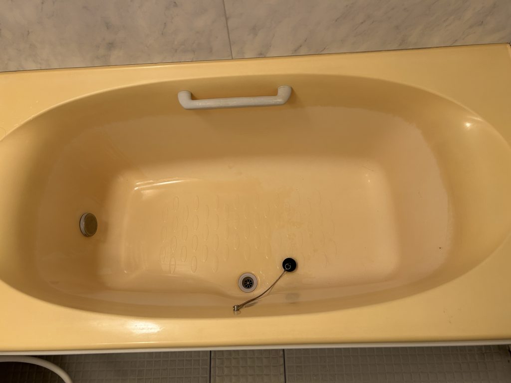 中古販売されるお宅のリメイク事例です。浴槽は経年により、お湯を溜める位置(だいたい2/3くらいの高さ)が、入浴剤等で変色してきます。これは、クリーニングではどうしようもないので、取り替えるか、このまま使用するかになります。もちろん、そのまま使用しても問題はありませんが、販売や賃貸で貸し出す場合は、何かしらの対策が必要ということで、今回、塗装をさせて頂きました。また、床面(洗い場)の表面も同じようにクリーニングでは落ちないシミ?があったので、バスナフローレを貼らせて頂きました。工期は3日間でした。