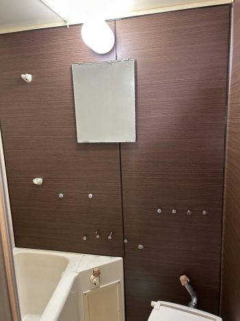 そこで、昨日、施工させて頂いた事例として、浴室の壁面の一部が、経年等でシミが落ちない場合、そのまま貸し出すのも気が引けるし、ユニットバスごと交換あするのも費用がかかるしと考えた場合、その、シミが落ちない面のみをリメイクする方法があります。